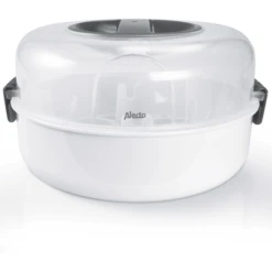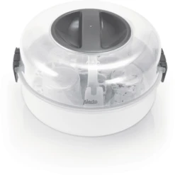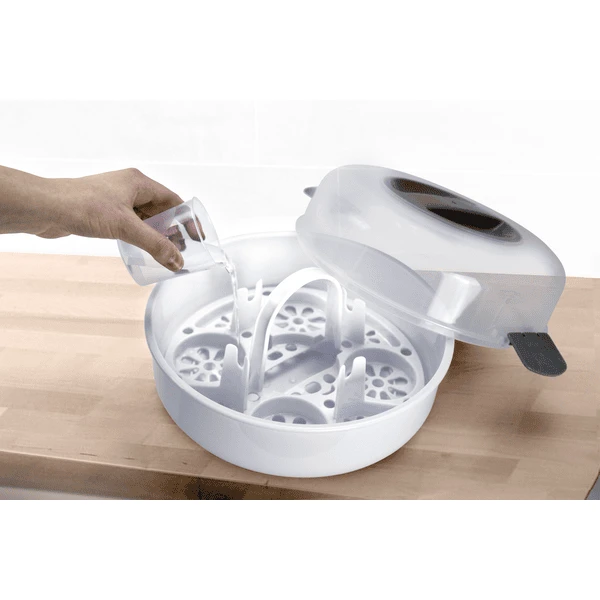 Product details: Design : wit Past op alle standaard magnetrons Werkt met kraanwater Handig formaat, praktisch voor op reis Steriliseert 99,9% van de bacteriën in 6 minuten Kan tot 4 babyflessen van 150 ml tegelijk bevatten Kan gesteriliseerde accessoires tot 24 uur steriel houden BPA vrij Snel en gemakkelijk te gebruiken