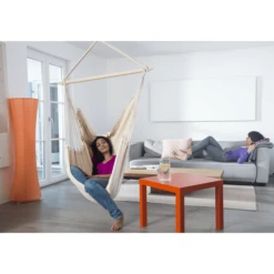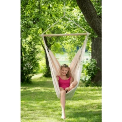 Uit Brazilië, het Siësta-wereldkampioen land, in deze hangstoel kan je kind lekker dromen: 1,30 m breed en 1,60 m lang, een Brasil King Size formaat en is bijna zo groot als de klassieke Braziliaanse hangstoel. Naad is 4 keer genaaid en een extra dikke 400 g/ m² stof, dit zorgt voor een hoog draagvermogen.
