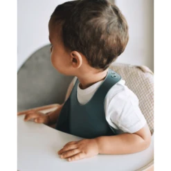 - Het slabbetje met opvangbakje wordt met twee stoffen koorden aan de hals gebonden en past zich aan de halsmaat van het kind aan.