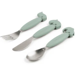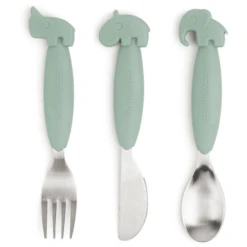 Het schattige bestek heeft zachte, antislip siliconen handvatten en zal snel een favoriet worden. Het formaat van het kinderbestek is perfect voor zelfstandige peuters die net zelfstandig leren eten.