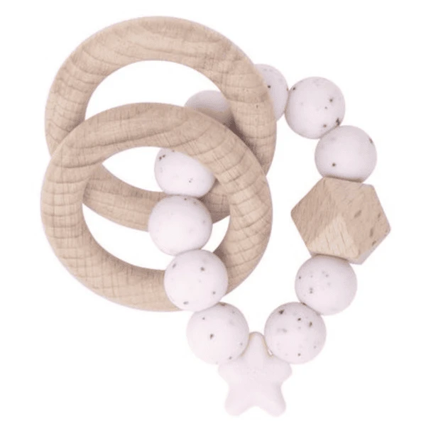 Bijtring en rammelaar STELLAR Griffioen Gespikkeld RozeGeschikt als bijtring, grijpspeeltje en bijthulp. Om de ontwikkeling van motorische en haptische vaardigheden te bevorderen en het doorkomen van tandjes te vergemakkelijken.Product details: twee houten ringen verbonden met een siliconen kogelketting natuurlijk, duurzaam gewonnen beukenhout gecombineerd met 100% voedselveilige siliconen geen BPA, ftalaten, lood of andere schadelijke chemicaliën