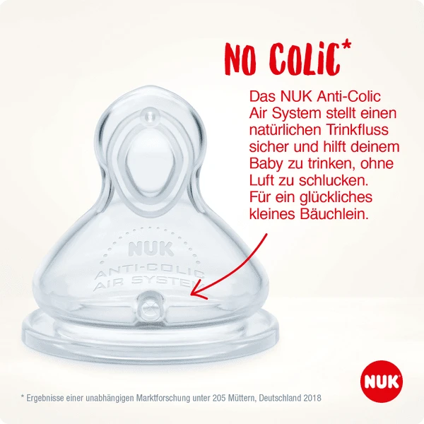 Het NUK Anti-Colic Air System zorgt voor een natuurlijke drinkstroom en helpt uw baby te drinken zonder lucht in te slikken. Voor een blij buikje.