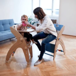 Kleine kinderen voelen zich vaak als Gulliver in Reuzenland in een wereld waar alles volwassen is. Daarom kopen veel ouders een kindertafel. Met een multifunctioneel kindermeubel is deze extra investering niet meer nodig, want met een paar eenvoudige stappen kan de multifunctionele kinderstoel worden omgetoverd tot een kindvriendelijk tafeltje met een fauteuil. Zo kunnen de kleintjes veilig aan hun eigen tafeltje zitten en naar hartelust schilderen, knutselen en spelen.