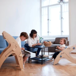 Met een paar eenvoudige stappen kan hij worden omgebouwd tot een wip, een kleine kindertafel met een fauteuil, een trapje, een hoge standaard, een speeltoren of een grote, lage fauteuil.