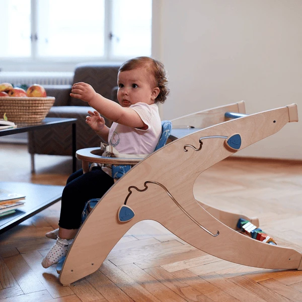Het klassieke hobbelpaard is nog steeds een van de populairste bewegingsspeeltjes voor kleine kinderen. De innovatieve kinderstoel kan in een paar stappen en zonder gereedschap worden omgebouwd tot een stabiele wipstoel. Een optioneel verkrijgbaar speelgoedstuurwiel van hout brengt kleine piloten in een racestemming. Met het optionele houten giraffekopje kunnen kinderen op de schommel safari . Hoogwaardige kunststof lippen op de lopers voorkomen uitglijden en beschermen tegelijkertijd de vloer.