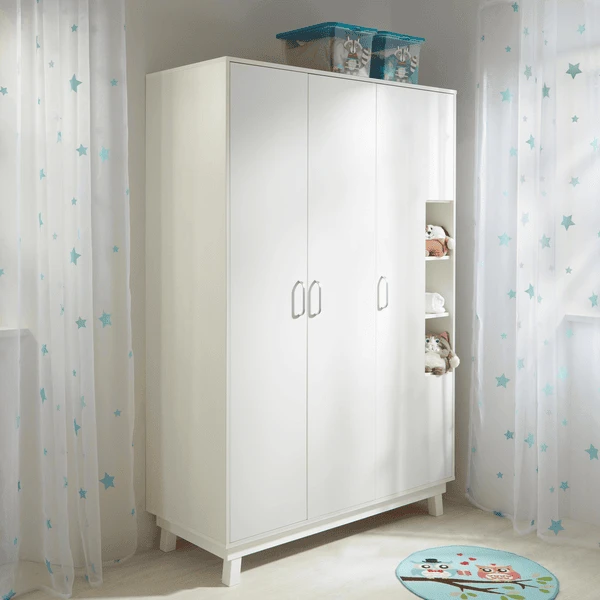 De 3-deurs roba garderobekast Nordic wit met organiseervakken en 2 kledingstangen biedt veel opbergruimte voor uw baby- & kinderkamer. De soft-close technologie van de deuren zorgt voor bijzonder comfort en veiligheid. De in totaal 4 legplanken en 2 Metal l roedes binnenin en de open vakken zorgen voor orde in de kinderkamer. Dankzij de aanpasbare hoogte van 195/185 cm (met/zonder voetjes) groeit de kast met het kind mee tot het volwassen is. Bovendien kan de kast ook zijwaarts worden gemonteerd, afhankelijk van de persoonlijke behoeften.