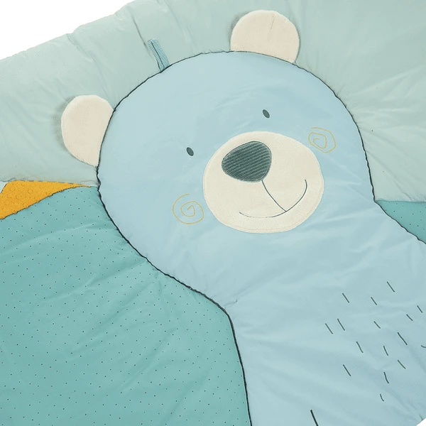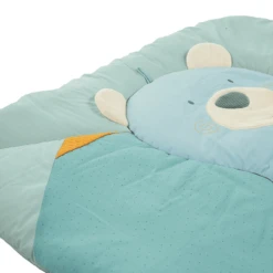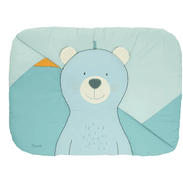 Baby’s eerste speeltuin! De zachte kruipdeken van poly cotton , fleece en jersey, met motief beer “Ben”. Met pieper en knisperend papier.